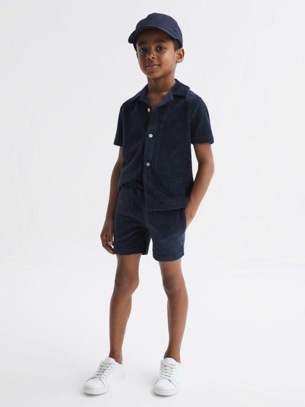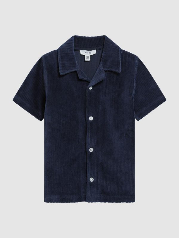 The Santal shirt in navy features a cool cuban collar and short sleeves for a relaxed aesthetic. The button-through design is effortlessly wearable, and it’s crafted from a textured jersey fabric for a soft hand feel.