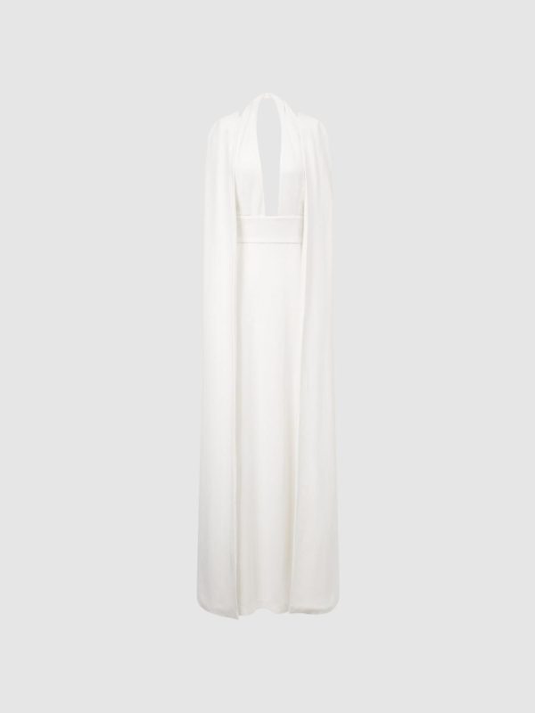The Grace dress in white is designed for special occasions. It s cut with a plunging neckline that forms a halter-neck, then flows to the ankle via a fluid maxi skirt. It features a detachable cape, accentuating the luxe feel, adding a chic layer. Wear it with heels for a confident evening edit.