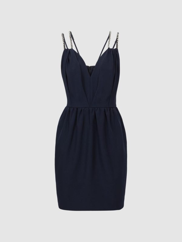 Feminine features inform the navy Justine mini dress, making it an appealing option for your special occasion plans. Note the double, embellished shoulder straps and flattering sweetheart neckline. Pleat detailing accentuates the chest, cinching in the bodice for a voluminous skirt. Choose plain or embellished accessories to suit your taste.