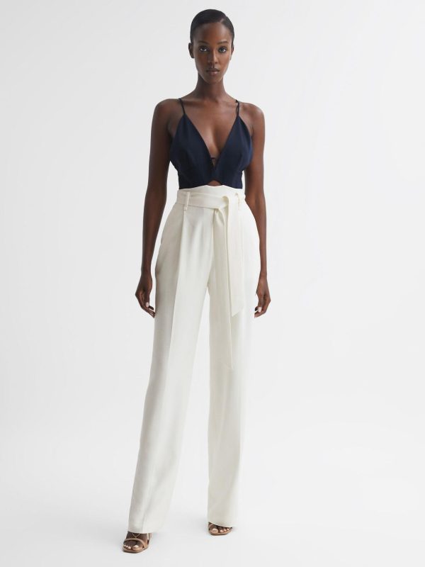 The India jumpsuit is a navy and white colour block design, cut to sit smoothly against the profile. It’s fitted with a plunge neckline and open-back detailing for understated allure. A waist belt further accentuates the figure. Pair with heels for special moments that demand confident dressing.