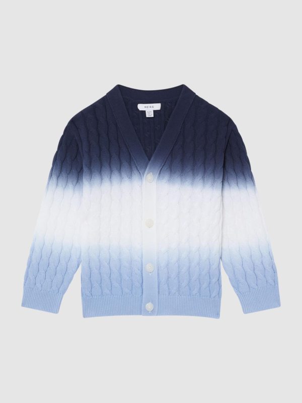 The Cosmo cardigan in blue is this season s coolest layer. It s designed in an ombre cable knit that brings a sense of fun to the wardrobe. Style it over a T-shirt with shorts and trainers to refine his relaxed looks.