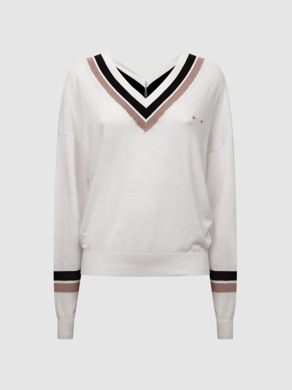 A preppy-style aesthetic informs the Bonita V-neck jumper, thanks to its iconic striped detailing. It’s cut in a comfort fit for a relaxed wear, and elasticated cuffs refine the silhouette. Style with wide-leg trousers and your favourite trainers.