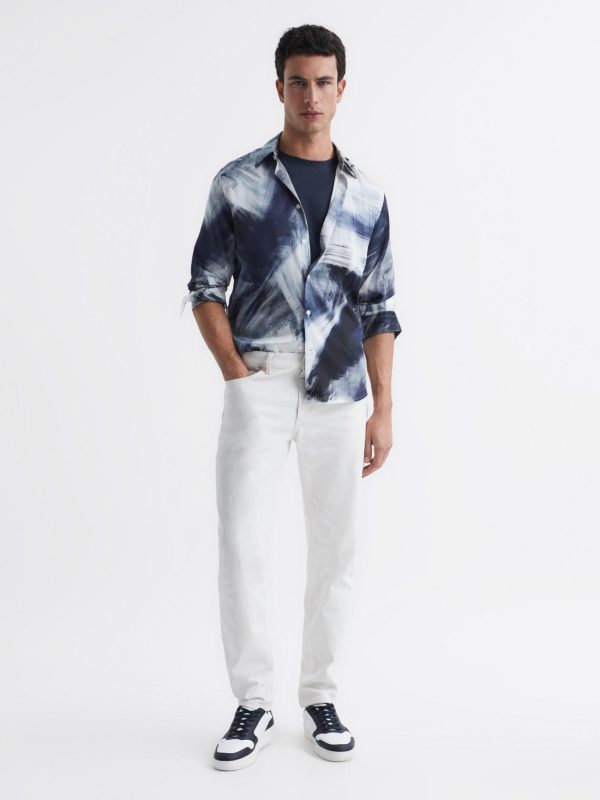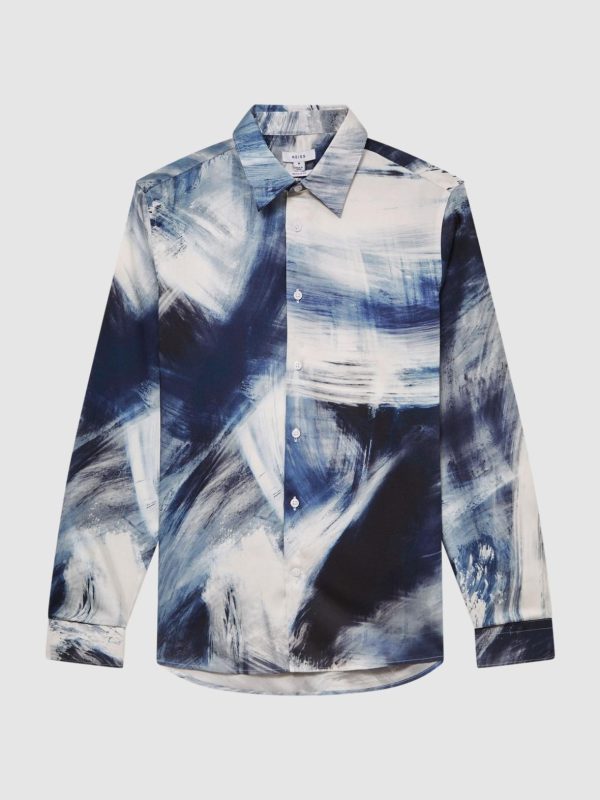 Slim Fit Printed Shirt The Dissly long sleeve shirt in navy has formal features such as a buttoned placket and point collar, whilst its paint-stroke print lends a contemporary feel. It’s cut in a slim-fit silhouette, ideal for layering over t-shirts and under jackets. Pair with jeans and trainers for a laidback look.