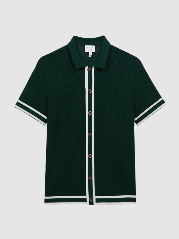 Knitted options are a cornerstone of the Reiss philosophy. Choose the dark green Icon shirt, a lightweight, button-through style designed with colourblock trims for a striking outlook. Pair with tapered trousers and espadrilles for a summer-ready edit.