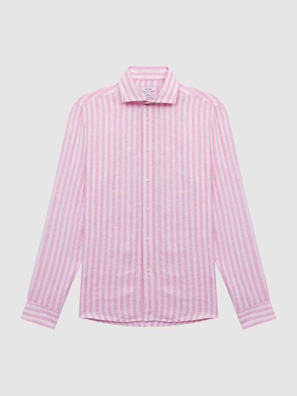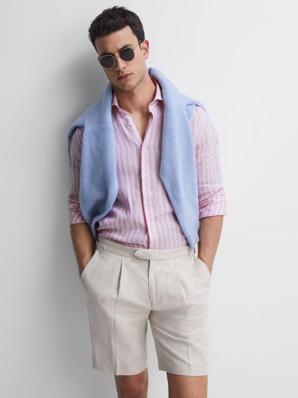 Engineered from a lightweight, linen fabrication with a subtle marl texture, the Ruban pink striped shirt marries classic comfort with a versatile style. This option is designed with a cutaway collar, for an understated modern edge. Find the perfect pairing in our new arrivals.