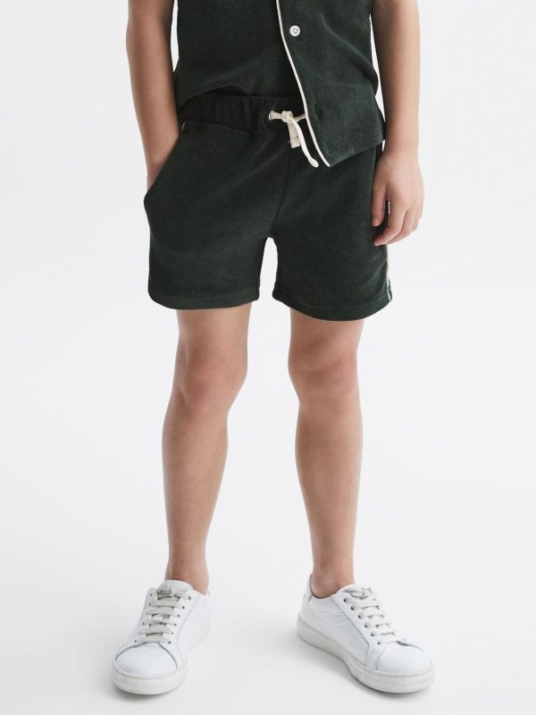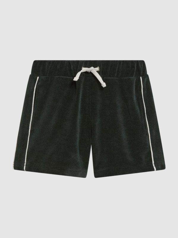Choose the green Fredericks shorts for a modern take on textured styling. They’re crafted from towelling and designed with a white side stripe, for a sports-inspired look. A drawstring waist is added for a secure, comfortable fit. Pair with the coordinating shirt for a sleek daytime edit.