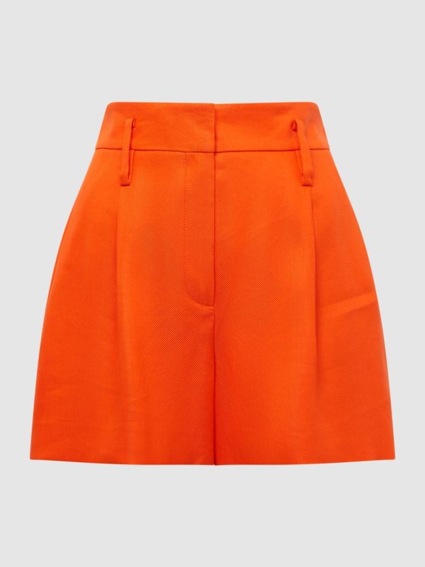 Sleek summer styling calls for the orange Hollie shorts. Their linen-blend fabrication makes them a breathable option for smart-casual moments. Mottled buttons detail the reverse, and pressed creases to maintain a formal note. Style with the coordinating blazer and choose flats or heels to suit the mood.