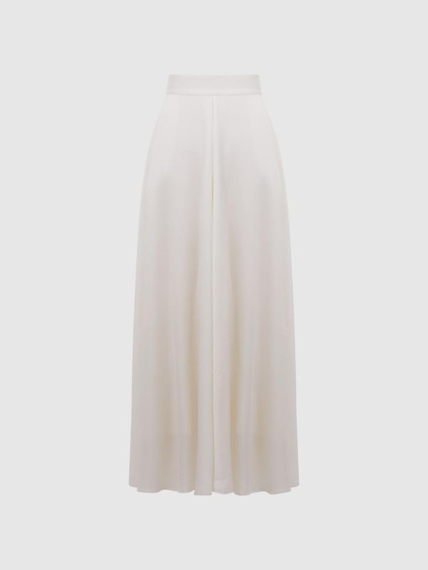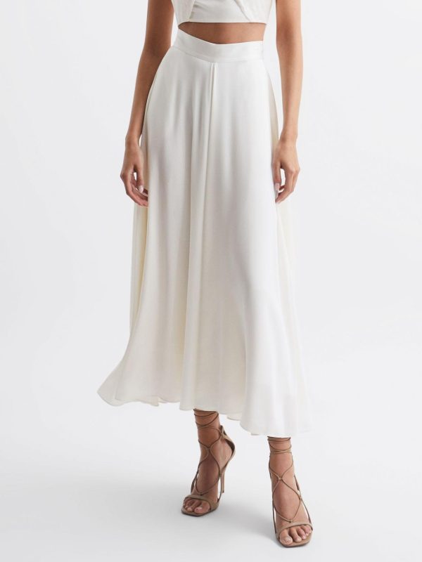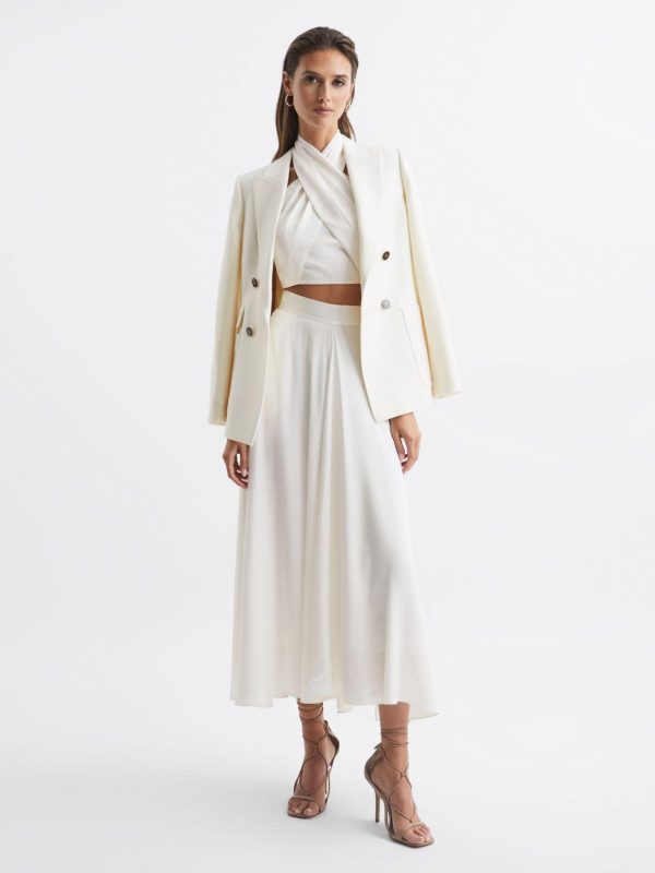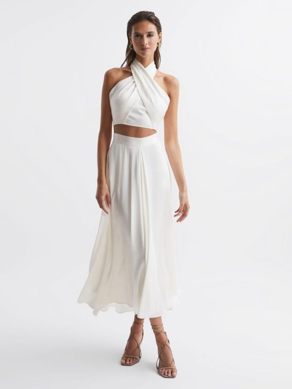 The ivory Ruby skirt sits high-rise, hugging the waist and skimming the hips, then falls gracefully to a maxi length. The flouncy fabrication showcases soft pleats, which lend a feminine note. Style with heels and the matching Ruby halter top for an elegant occasionwear edit.