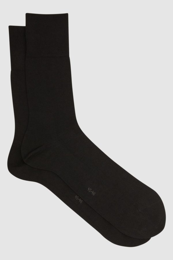 The Falke Tiago socks in black are crafted from a fil d écosse cotton blend for supremely soft wear and a rich colour appearance. They’re fitted with high-stretch ankle cuffs for day-long comfort, and anti-slip soles ensure a secure fit. Wear with your favourite Reiss trainers or dress shoes to lend a sense of luxury to your everyday.