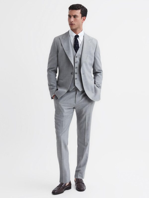 Choose the slim-fit Arrow waistcoat to elevate your formal edits. Crafted from a wool blend in a versatile soft-grey shade, it’s a reliable choice for occasions to come. Wear with the coordinating trousers and blazer for a complementary look.