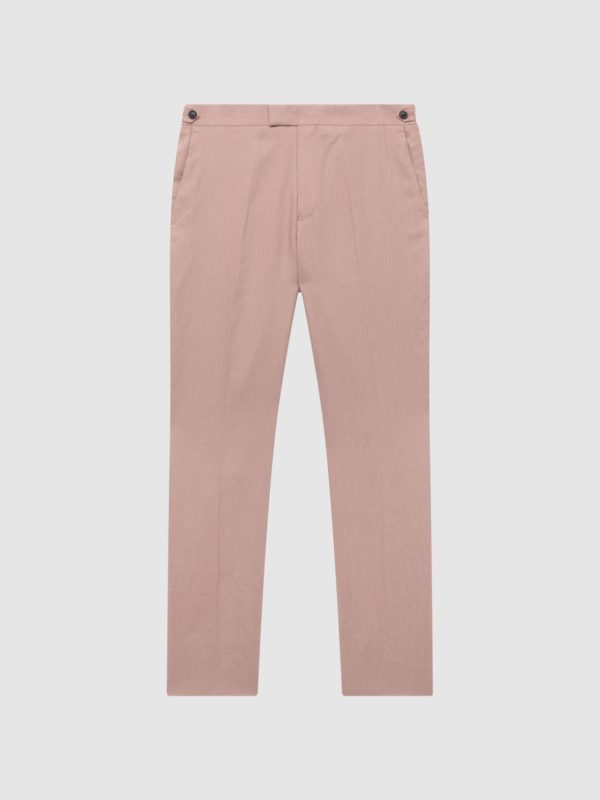 Give your suit collection a breezy update with the blush Kin, crafted from 100% linen for a lightweight, comfortable wear. These trousers remain traditional with side pockets and pressed creases, whilst their slim-fit silhouette and updated fabrication lend modernity. Style with the matching blazer and a tie from our collection for an aspirational look.