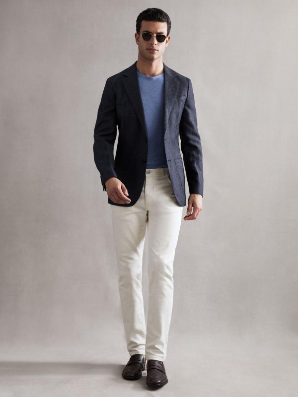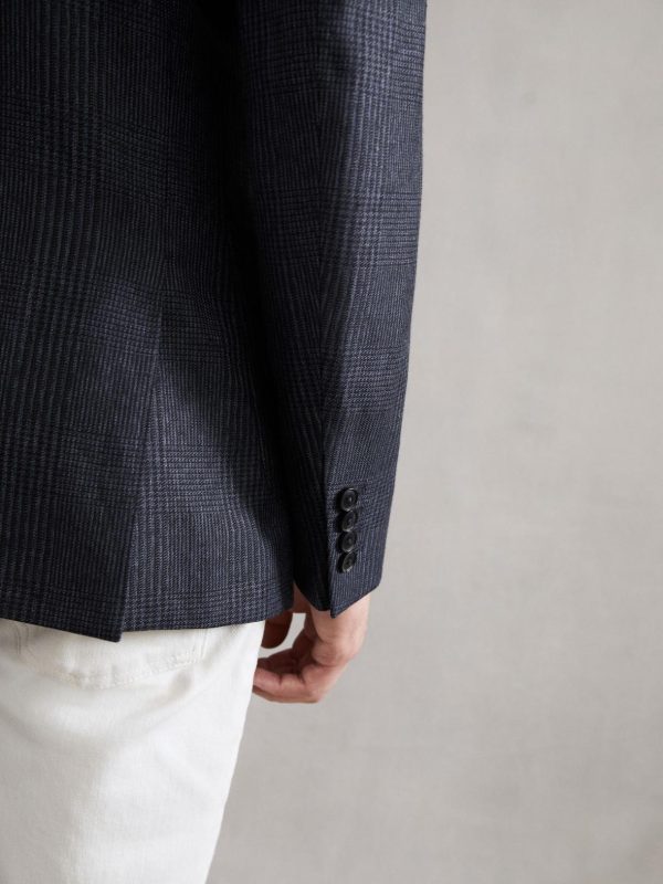 A linen-wool blend is chosen for the navy Matinee blazer, lending comfort and lightweight appeal. It’s woven into an on-trend Prince of Wales check design and cut to a single-breasted silhouette. Style with tapered trousers for a smart-casual look, ready for any occasion.