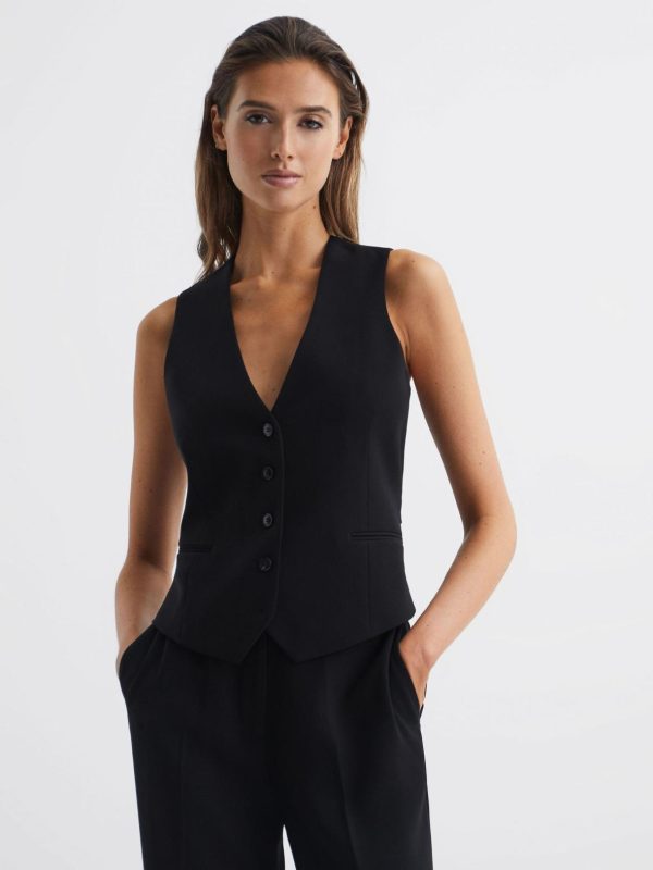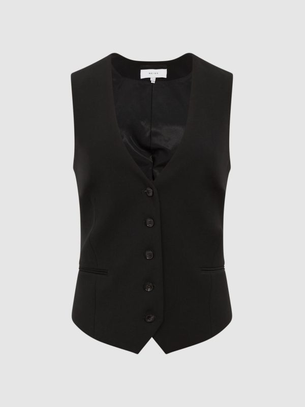 Add a heritage feel to your occasionwear rotation with the black Margeaux waistcoat. It’s inspired by a classic silhouette, cut with a deep V-neckline, side pockets, and a five-button front closure. An adjuster buckle is added to the reverse for a customisable fit. Wear alone or under a Reiss blazer for a desk-to-dinner edit.