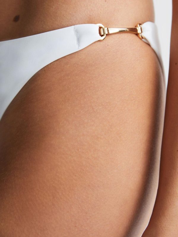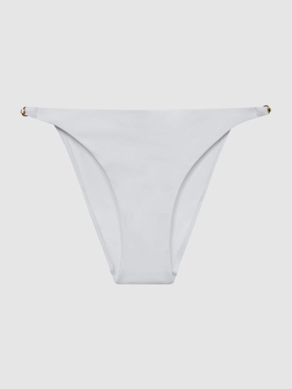 The white Alani bikini bottoms are a high-rise shape for your poolside plans. They’re fitted with gold-tone detailing to the sides, lending a modern edge. Style with the coordinating top and a coloured kaftan for a fresh take on holiday styling.