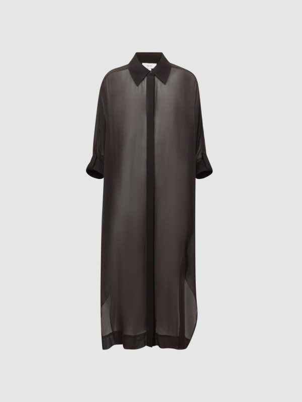 No holiday packing list is complete without the black Ava kaftan. It’s a sheer style fitted with ¾ length sleeves and side slips to tastefully showcase the frame. It’s a relaxed fit, making it a breezy option for exotic getaways. Style over your favourite Reiss bikini and choose sandals to complete your look.