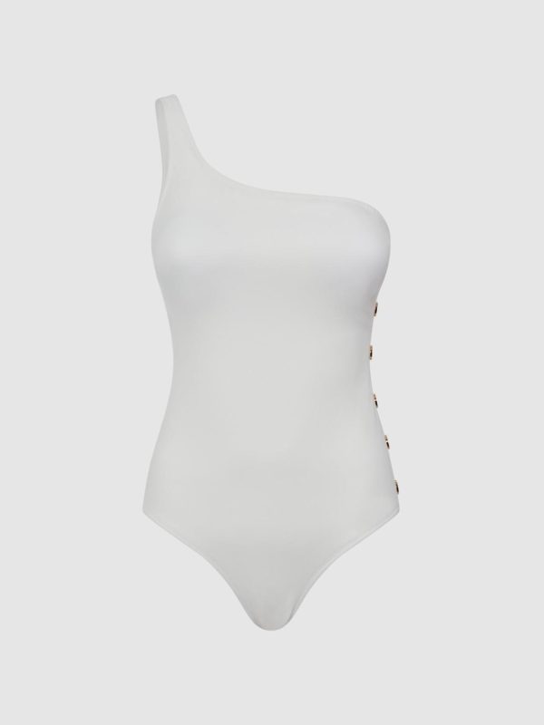 The white Bethany swimsuit is a contemporary choice for when poolside this summer. This vintage-inspired design is finished with gold-tone button detail to one side which adds a chic touch. Wear with oversized sunglasses?to add to the statement aesthetic.