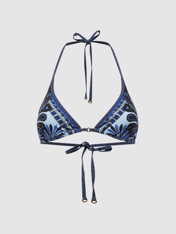 A modern, colourblock agenda informs the blue print Tina bikini top. It’s fitted with a halter neckline which ties at the reverse for a customisable fit. Gold-tone hardware provides a luxe edge. Pair with the coordinating bikini bottoms to complete the look.