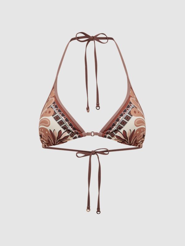 A modern, neutral agenda informs the Tina bikini top in tan. It’s fitted with a halter neckline which ties at the reverse for a customisable fit. Gold-tone hardware provides a luxe edge. Pair with the coordinating bikini bottoms to complete the look.