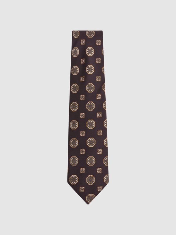 Crafted from 100% silk, the chocolate Imperio tie is the perfect final additional to your formalwear. The bold medallion print seamlessly blends traditional tailoring with modern design. Elevate your workwear looks or evening attire.