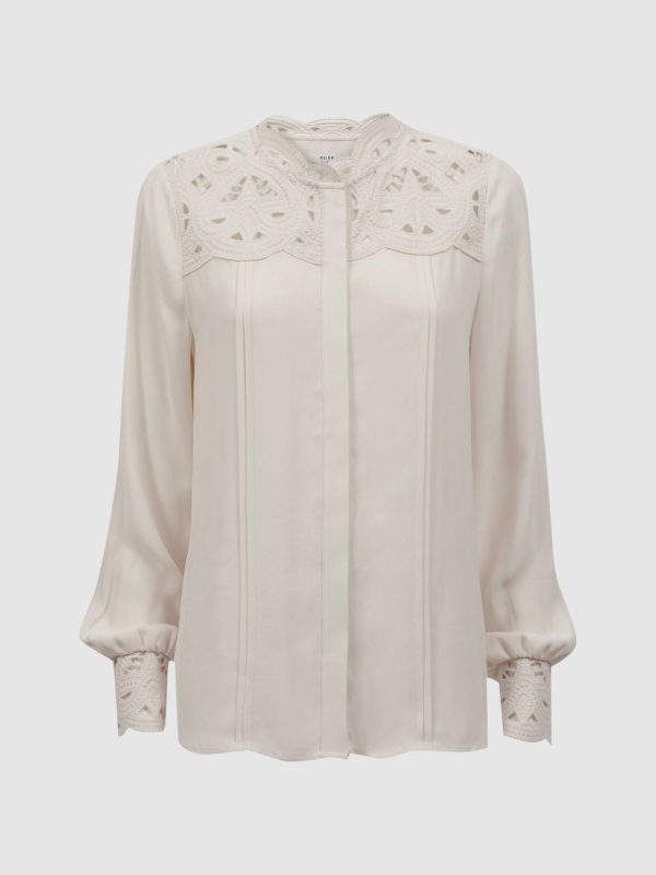 The ivory Celia blouse is a feminine pick, characterised by cut-out lace detailing. Its relaxed fit and long, puff sleeves lend a voluminous shape, ideal for days that demand confidence. Button up as required to suit your mood, then choose heels to heighten the look.