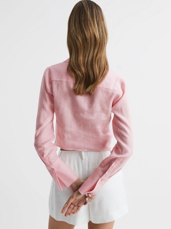 Choose a day-to-night staple rooted in sophistication. The pink Dahlia blouse is crafted from 100% linen for comfortable wear. It’s a cropped design fitted with a V-neckline and a front tie detail, imbuing a flattering, feminine mood. Wear with high-rise trousers and choose flats or heels to suit your mood.