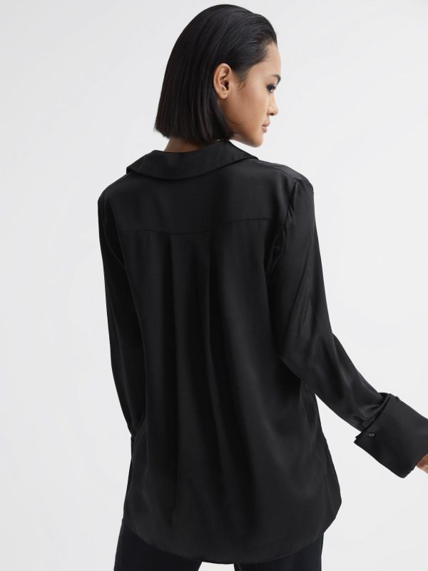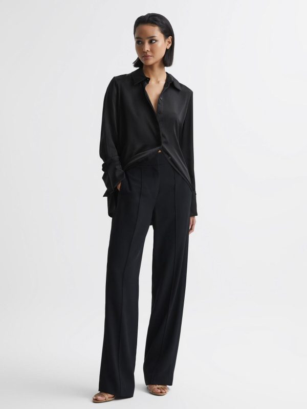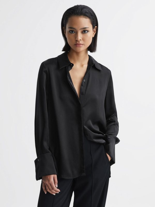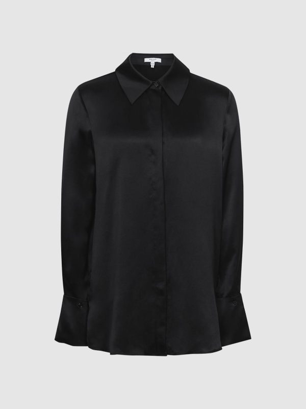 Choose the black Hailey shirt, cut from smooth silk for a sensual feel and a luxurious look. It’s punctuated by a concealed button closure and statement, oversized cuffs. Tuck into a pair of our wide-leg trousers, then add heels and a blazer for a refined, daytime look that easily transitions into evening plans.