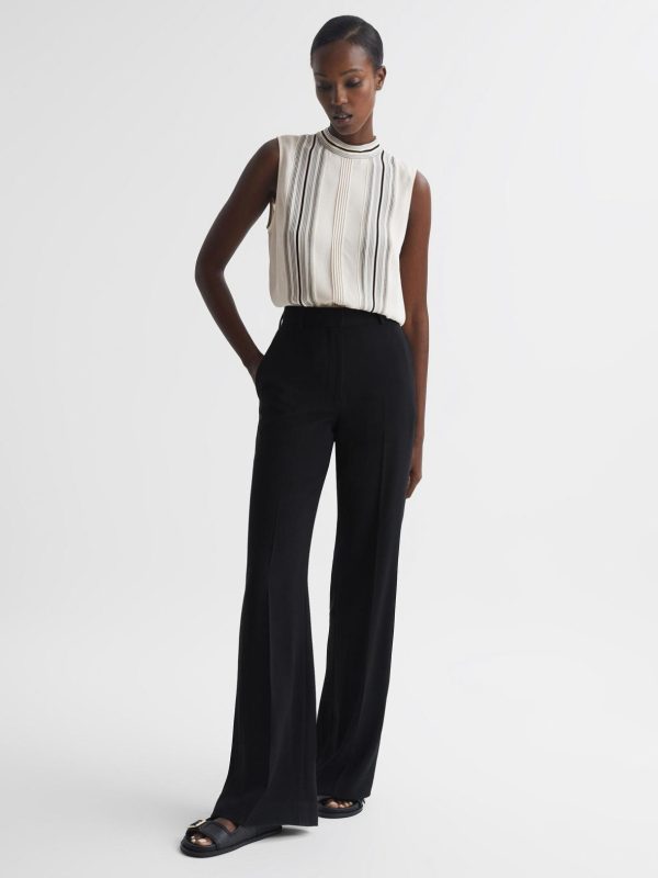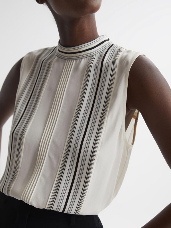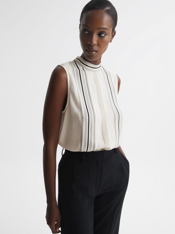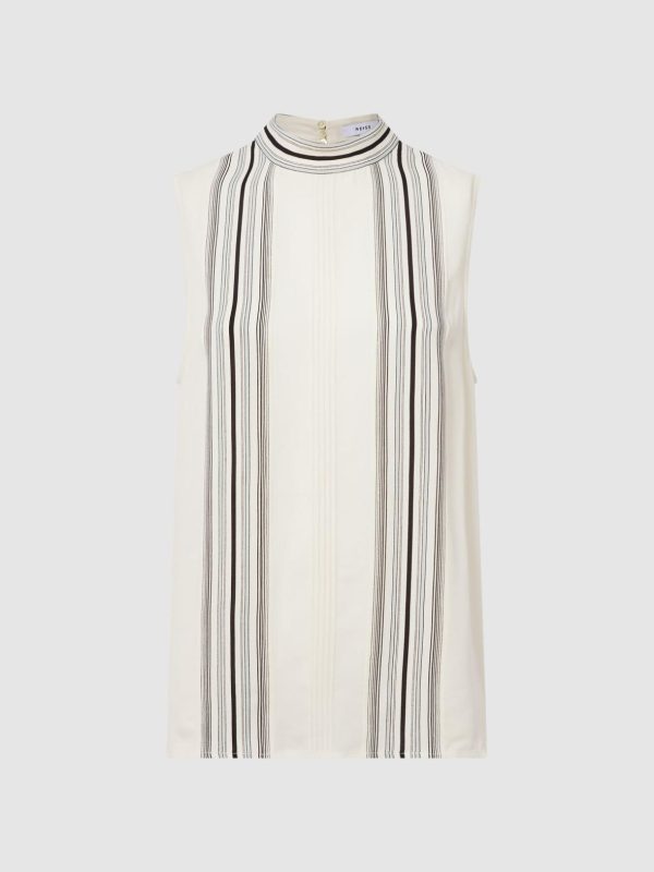 Choose the Mollie blouse in ivory for a look that lasts beyond the office. It’s crafted from a sheer fabrication in a sleeveless style. A striped design and pleated front panels are added for subtle interest. Pair it with tailored trousers and flat shoes, or elevate the look with heels.
