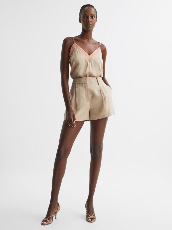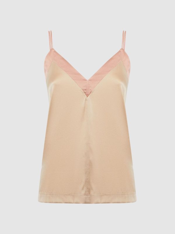 The Payton vest in pink and nude is a versatile option, suited for both daytime and evening events. It’s spun from a luxe silk blend into a colourblock design, with a soft jersey panel added to the reverse. Double shoulder straps feature as an element of refined style. Tuck into high-rise shorts and choose a blazer for a look that will take you through 9-5 and beyond.