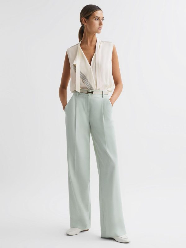 Build a feminine look with the Romy sleeveless shell top in ivory. It’s a collarless style fitted with a deep V-neckline, ideal for wearing alone or layering over a vest for office days. Stripe detailing and a necktie element add interest whilst remaining sophisticated. For an office-to-evening agenda, pair with tailored trousers and switch out loafers for heels.