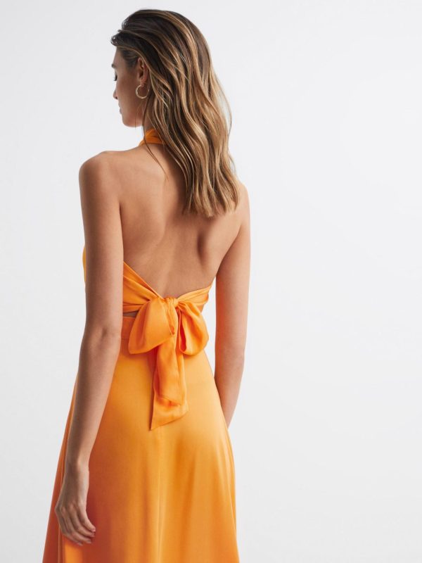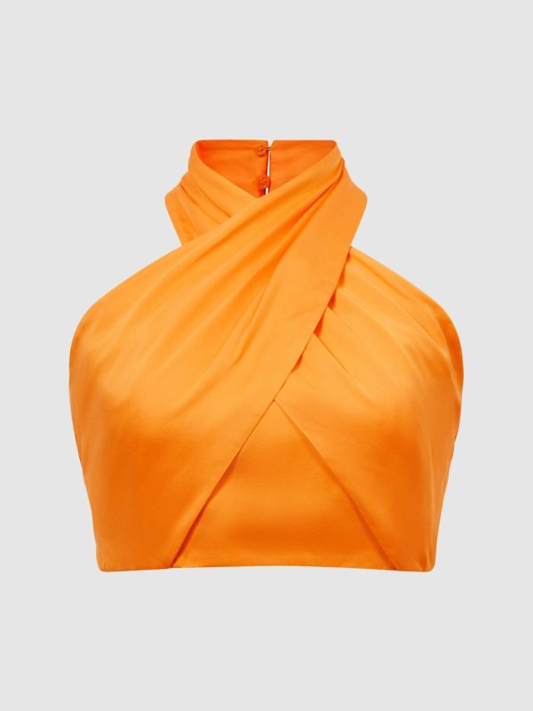 The orange Ruby top is cropped at the waist and features a cross-over halter design. It wraps across the chest and ties in a bow at the reverse, for an alluring open-back finish. Style with heels and the matching Ruby maxi-skirt for an elegant occasionwear edit.