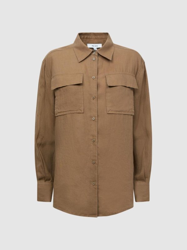 Safari-inspired dressing gets a fresh outlook with the Soul shirt. Its 100% linen composition and relaxed fit make it a favorable option for summertime styling. Patch pockets decorate the chest. Tuck into paperbag-style shorts for an urban edit.