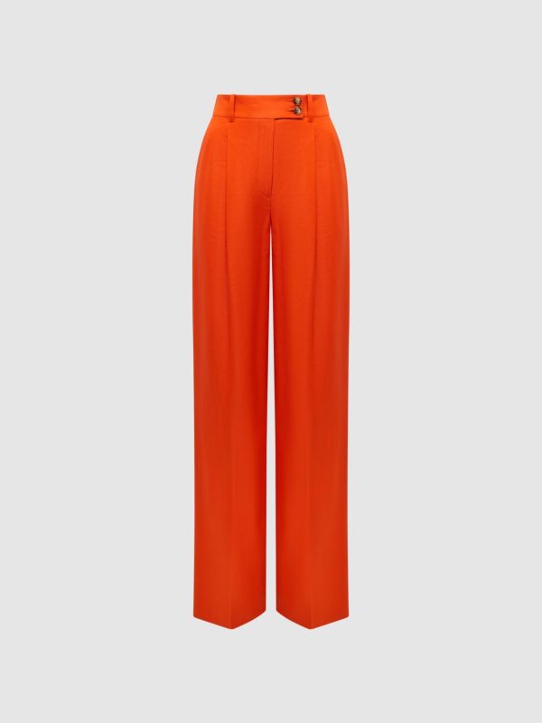 Sleek city styling calls for the orange Hollie trousers. Their linen-blend fabrication makes them a breathable option for smart-casual moments. Mottled buttons detail the front, and pressed creases maintain a formal note. Style with the coordinating blazer and choose flats or heels to suit the mood.