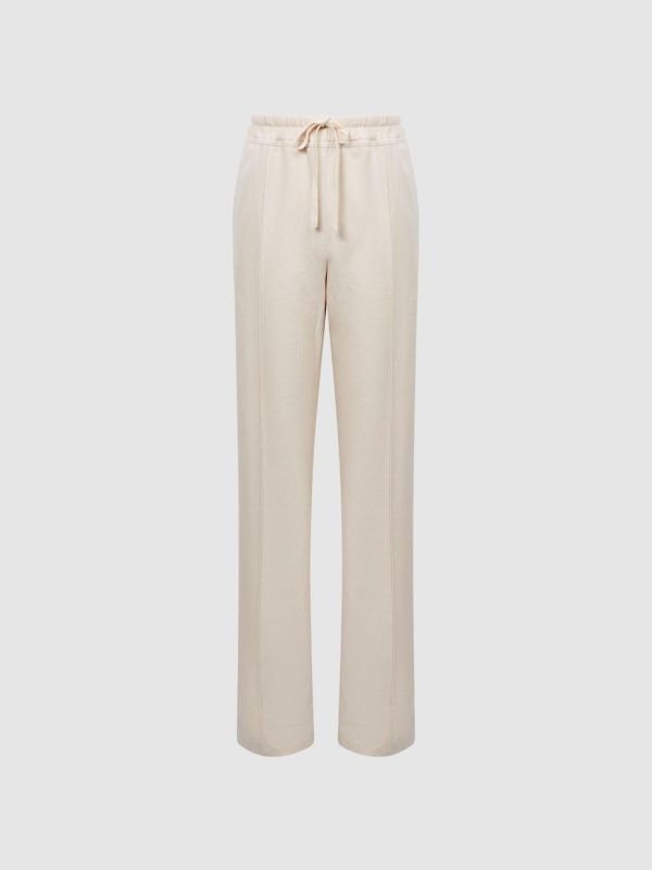 Embrace luxe leisurewear with the cream Juno trousers. They’re cut in a wide-leg silhouette and feature an elasticated drawstring waist for casual comfort. Side pockets are added for everyday practicality. Pair with knitwear for a cosy-chic edit.